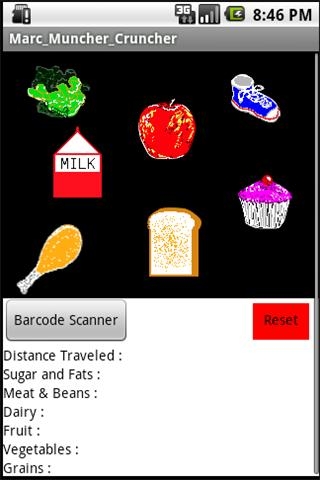The app also includes a bar code scanner and pedometer (shoe icon) and future upgrades will allow users to track their physical activity level and caloric intake as well as scanning in and evaluating the items on their grocery shopping list every week! The phone app will make it possible for adults to take it to the market with them and scan in everything they buy to make sure they are providing their children with a balanced diet. The bar code scanner and pedometer are still in the development stage and the icons are mostly there to represent future upgrades.