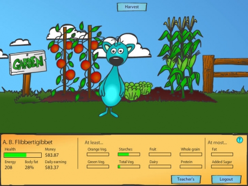 In the game children are given responsibility to make nutritional choices for a virtual pet. Meters showing daily nutritional requirements and limits fill as the player gives the critter food. Each day the meters are reset so they can be filled again. Food may be purchased at a grocer or harvested for free from a garden. Players can get creative by combining foods into recipes, which can be saved and prepared again automatically. Meals of high nutritional quality can be sold for a profit.